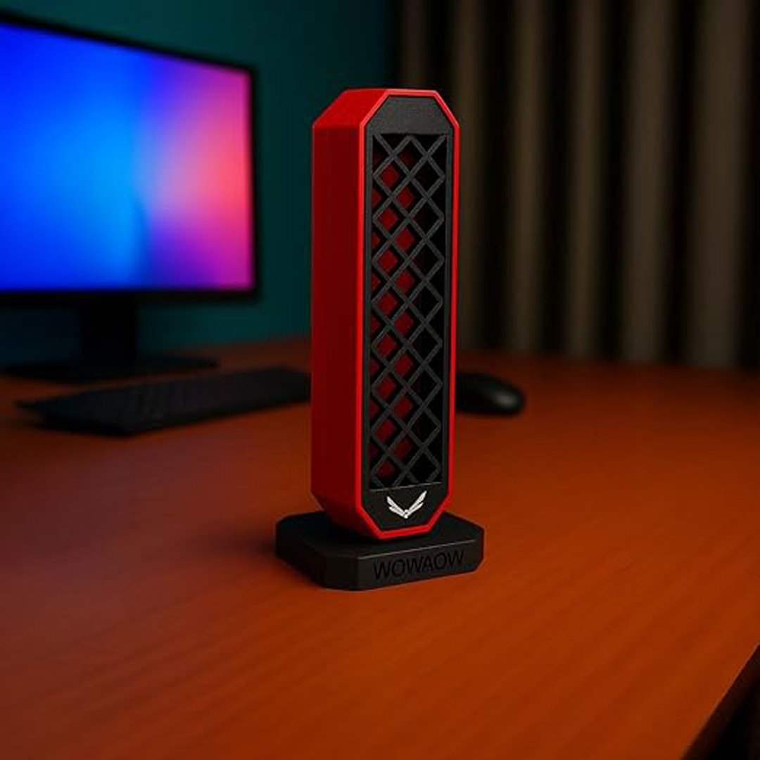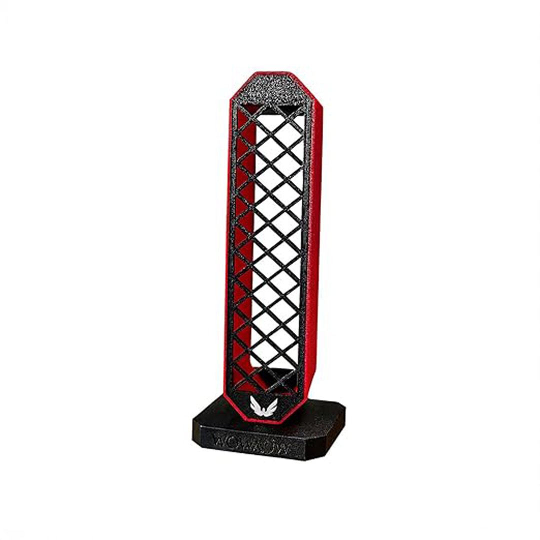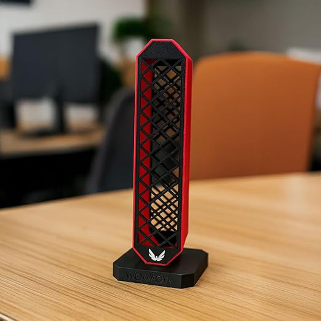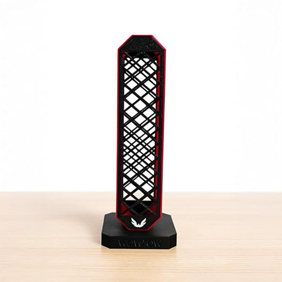 Elevate your gaming setup with the Wowaow Gaming Headphone Stand, a premium accessory that combines style with functionality. This sleek stand features an innovative lattice design crafted in striking black with bold red accents, creating a modern aesthetic that complements any gaming station or workspace. The distinctive hexagonal pattern not only delivers visual appeal but also provides structural integrity, while the stable base ensures your headphones remain secure and well-displayed. Perfect for gaming headsets and studio headphones alike, this 3D-printed stand keeps your audio gear organized and easily accessible. The durable construction protects your valuable headphones from scratches and damage, while its compact footprint maximizes desk space efficiency. The signature Wowaow branding and wing emblem add a touch of sophistication to this practical accessory. Whether for a professional streaming setup, home office, or gaming corner, this headphone stand serves as both a practical storage solution and an eye-catching display piece that showcases your gaming gear with style.