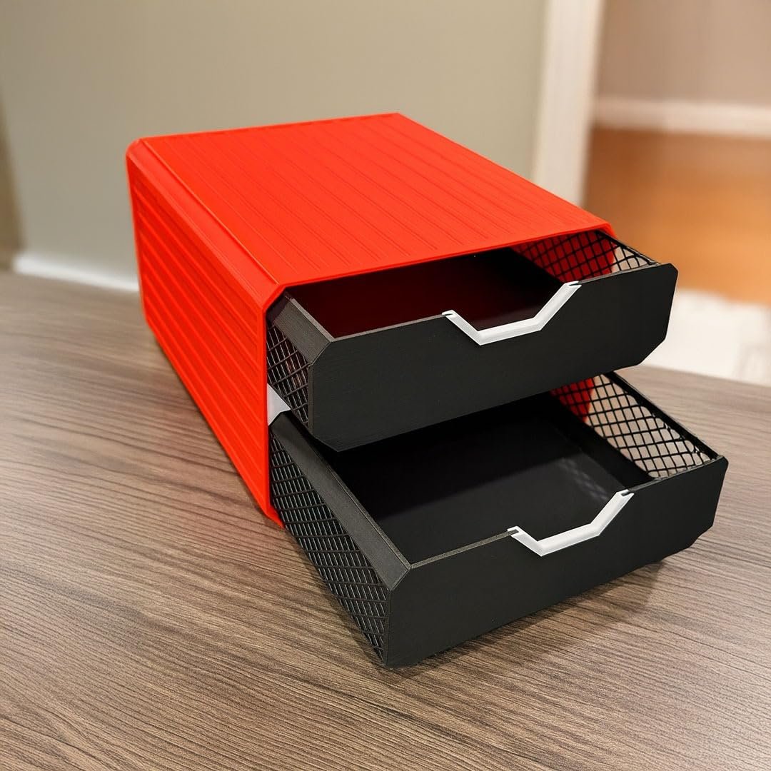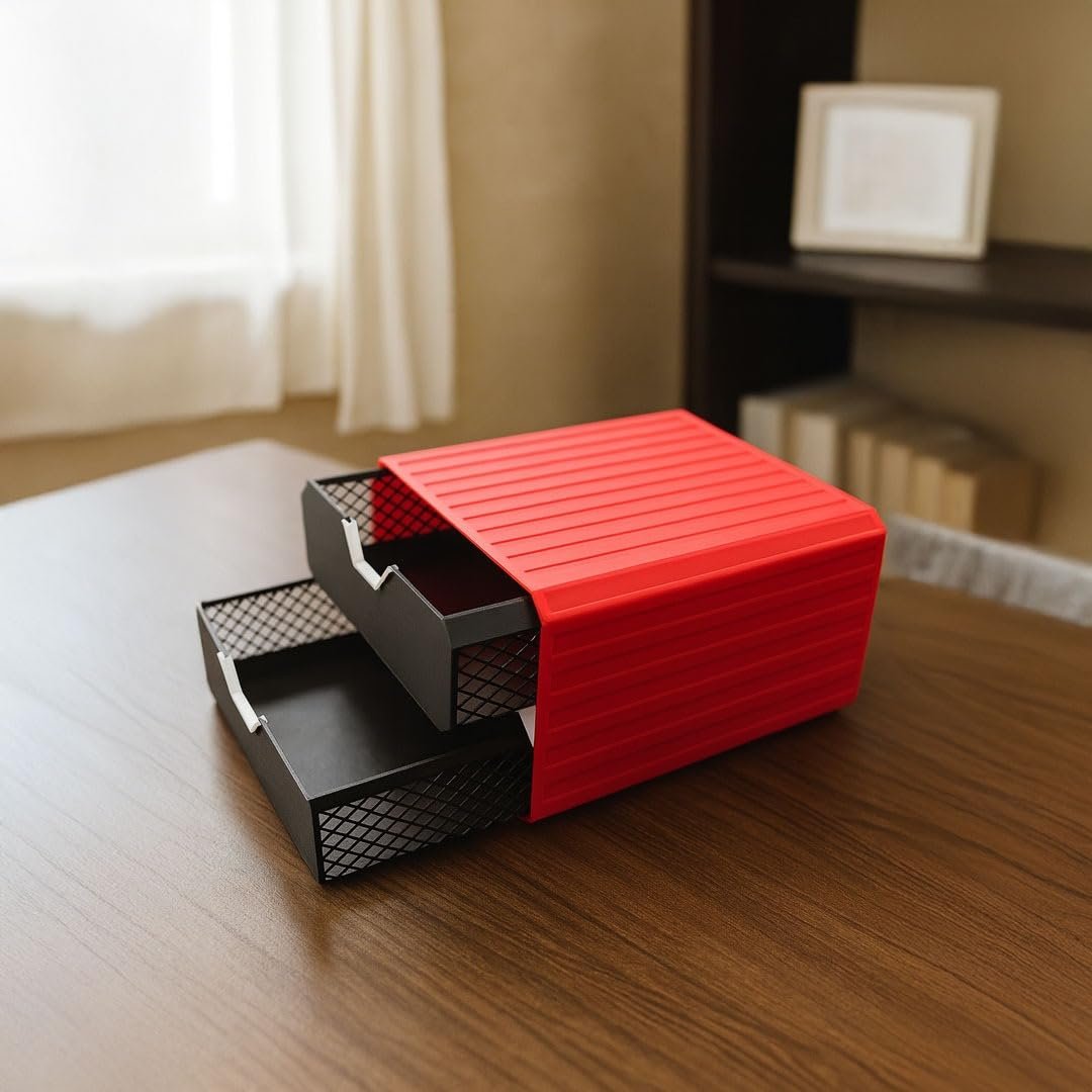 Transform your workspace with this sleek and practical dual-drawer desk organiser. Featuring a striking red exterior shell complemented by sophisticated black drawers, this storage solution combines style with functionality. The two spacious drawers, enhanced with durable mesh side panels, provide ample room for organising files, documents, stationery and office essentials. Each drawer is equipped with ergonomic cut-out handles in elegant white trim, ensuring smooth access to your items. The robust ABS plastic construction guarantees durability while maintaining a modern aesthetic appeal. Perfect for home offices, corporate workspaces, or study areas, this compact organiser helps maintain a clutter-free environment without compromising on desk space. The contemporary design with its bold colour combination adds a professional touch to any setting while keeping your essentials within easy reach. Whether you’re storing important documents, daily stationery, or office supplies, this versatile organiser helps maintain order with its practical two-tier storage system.